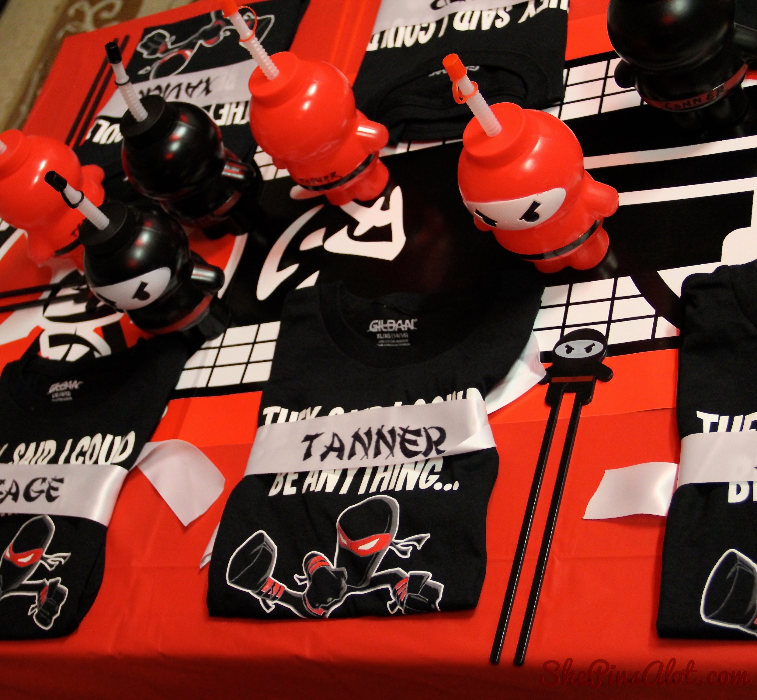 Every kid loves getting party favors! I hate sending them home with plastic junk that just gets thrown away so I like to give them things that add to the party itself. This time around I scored at Walmart with Ninja T-shirts! These were even more than awesome as they glowed in the dark!
