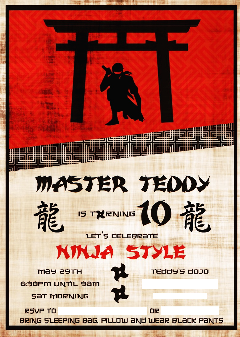 What boy doesn’t love ninjas! This was an amazing theme to tackle. There were so many ideas popping out of my brain that I couldn’t wait to put it all together. We recently had our spring break trip to Japan in April so the inspiration definitely came from that! And now that I had my theme, I had to decide what the details of this shindig would be. Teddy’s always always always begging for sleep overs, and while I loathe them ( I value sleep pretty highly ) he for some reason thinks they are super fun. So – a ninja sleep over it would be. Next up was keeping the number a bit smaller for this type of party. Two years ago when I did an army themed party for him I ended up with over twenty five kids. NO WAY was this going to be a sleep over with that many haha. Im crazy, but not that crazy! So we ended up with 11 boys, plus Teddy which was perfect. The damage done by this number to my house was within reason. 😉
