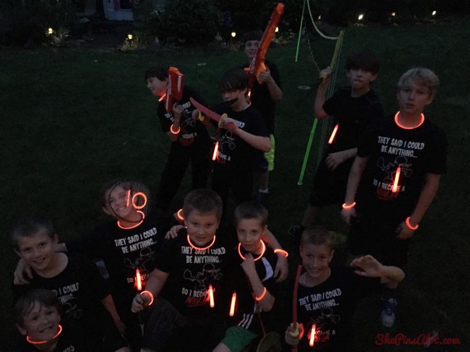 We didn’t have any set games this time. I set up the badminton set in the backyard and found a birdie for it that had a red LED light in it! and then I loaded them all up with lots of red glowing things and with their foam swords and a few Nerf guns they had a blast just having free play for part of the night!
