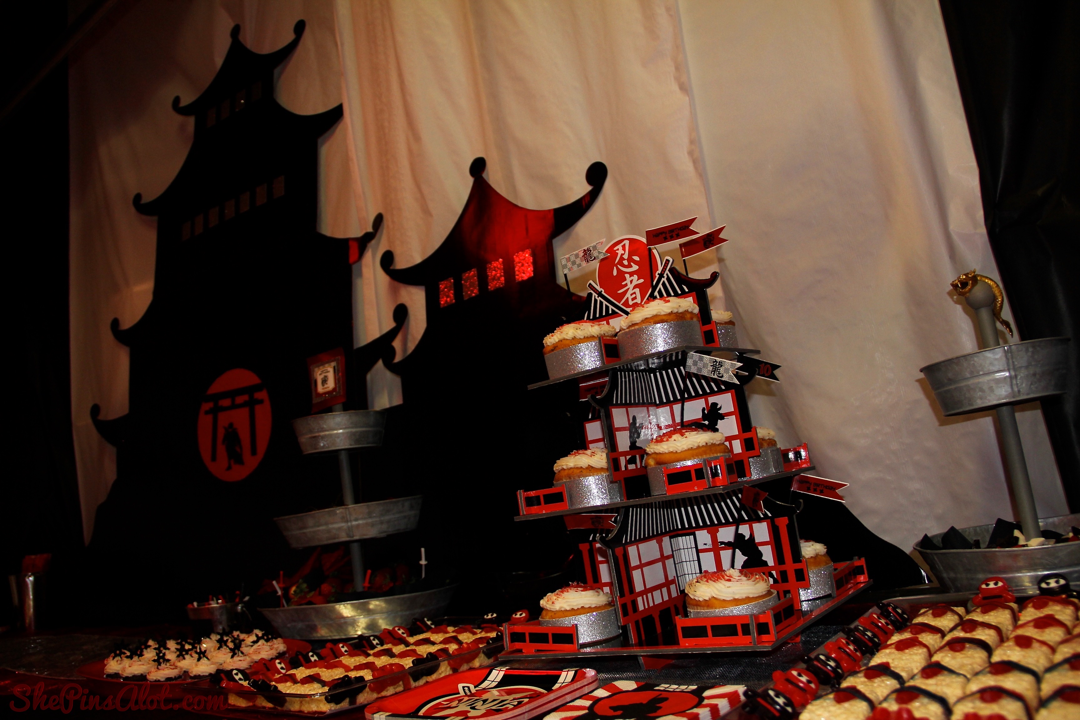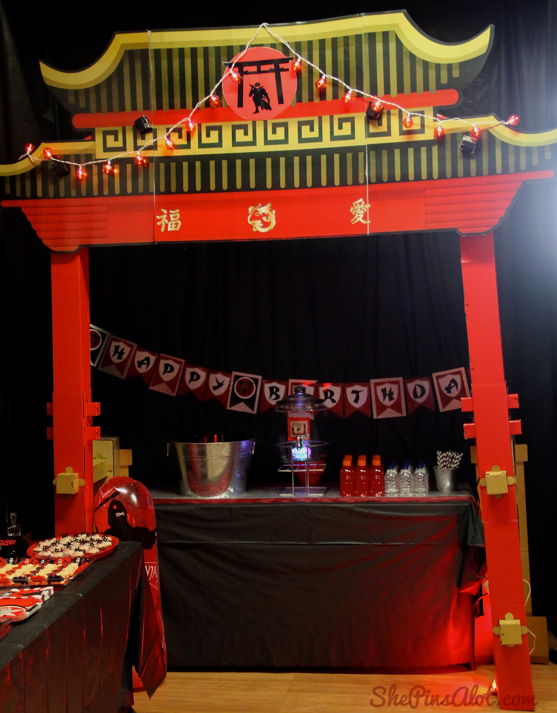 When I first ordered this huge Tori Gate, I wasn’t sure exactly where it was going to go, but as soon as I realized that the beverage table was small enough for it to fit around – its purpose was clear! This was perfect! I also have an awesome husband that I suckered into putting it together for me. It’s all made out of cardboard that required a wee bit of folding and a whole heck of a lot of patience. I added the circle ninja printable to the center of it to incorporate it into the theme a little better as well.