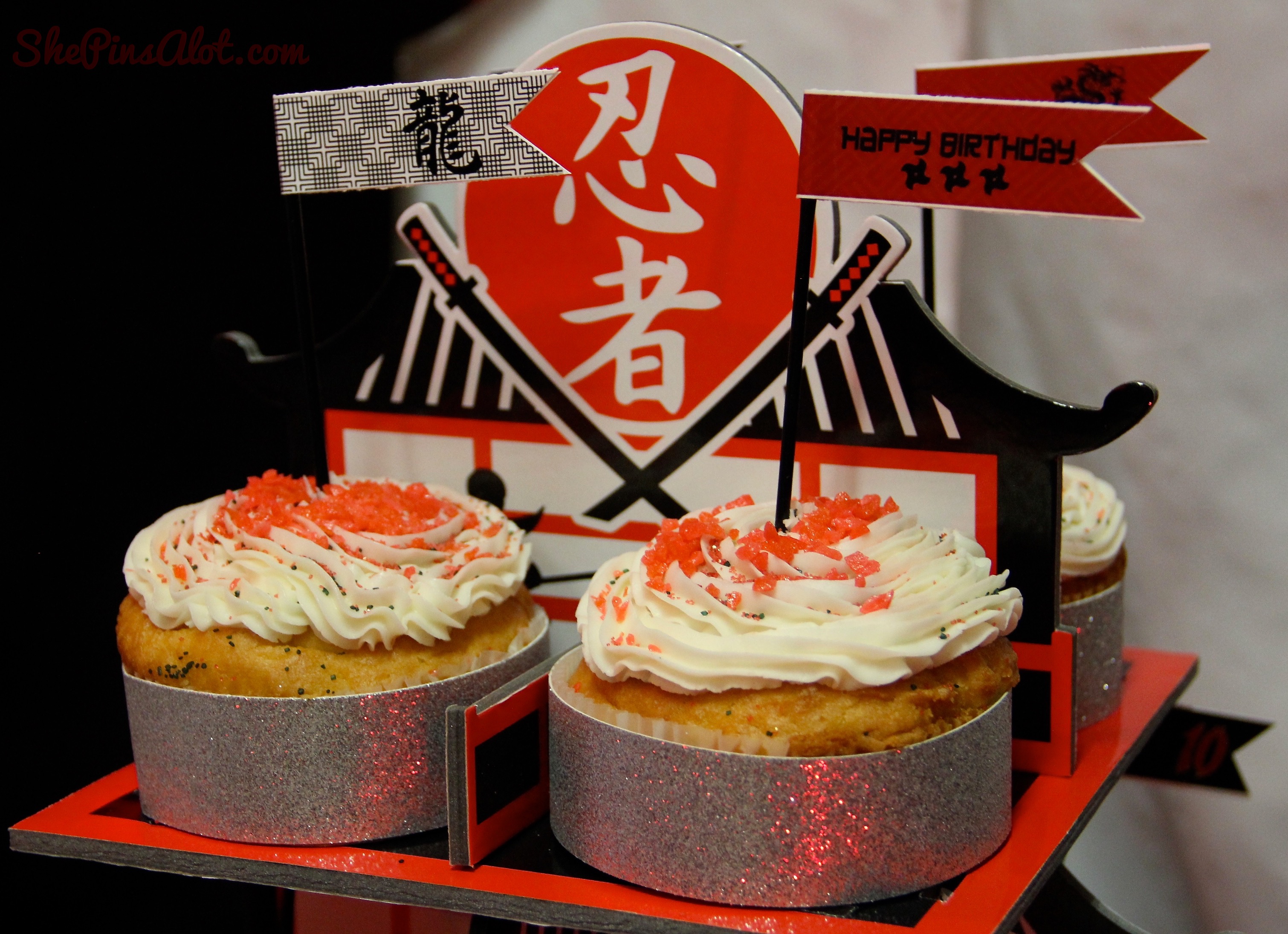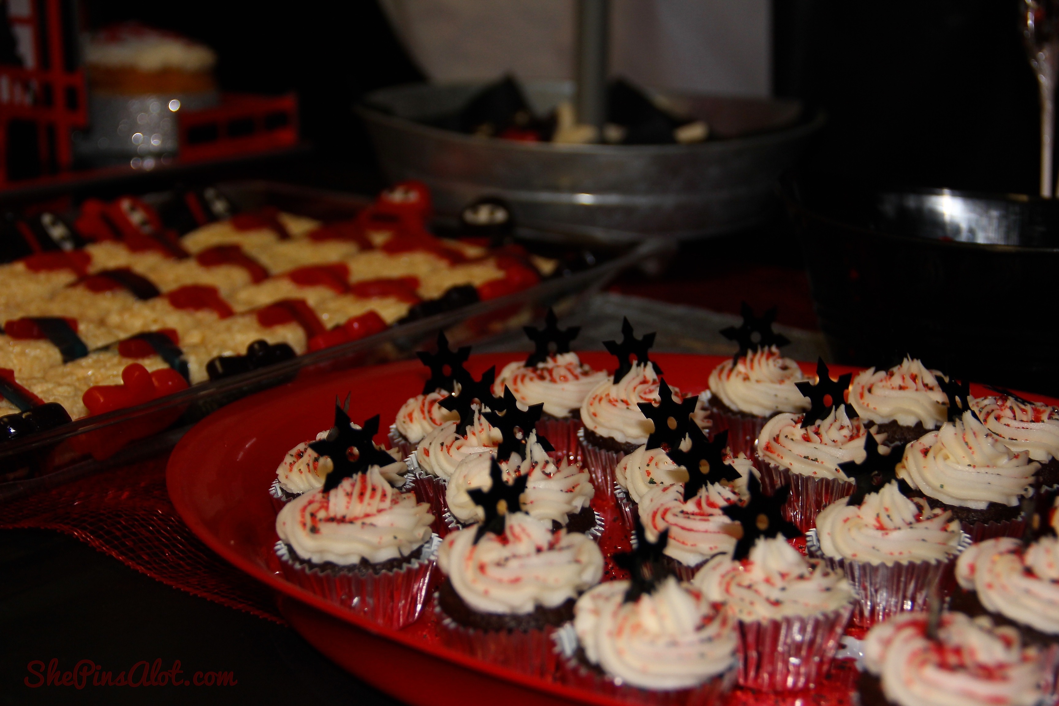 Mini chocolate cupcakes were topped with the Ninja star confetti that I found through OTC ( Oriental Trading Company ) One of my favorite things are foil cupcake wrappers as they look the best after baking and no fancy “wrap” is needed to be added.