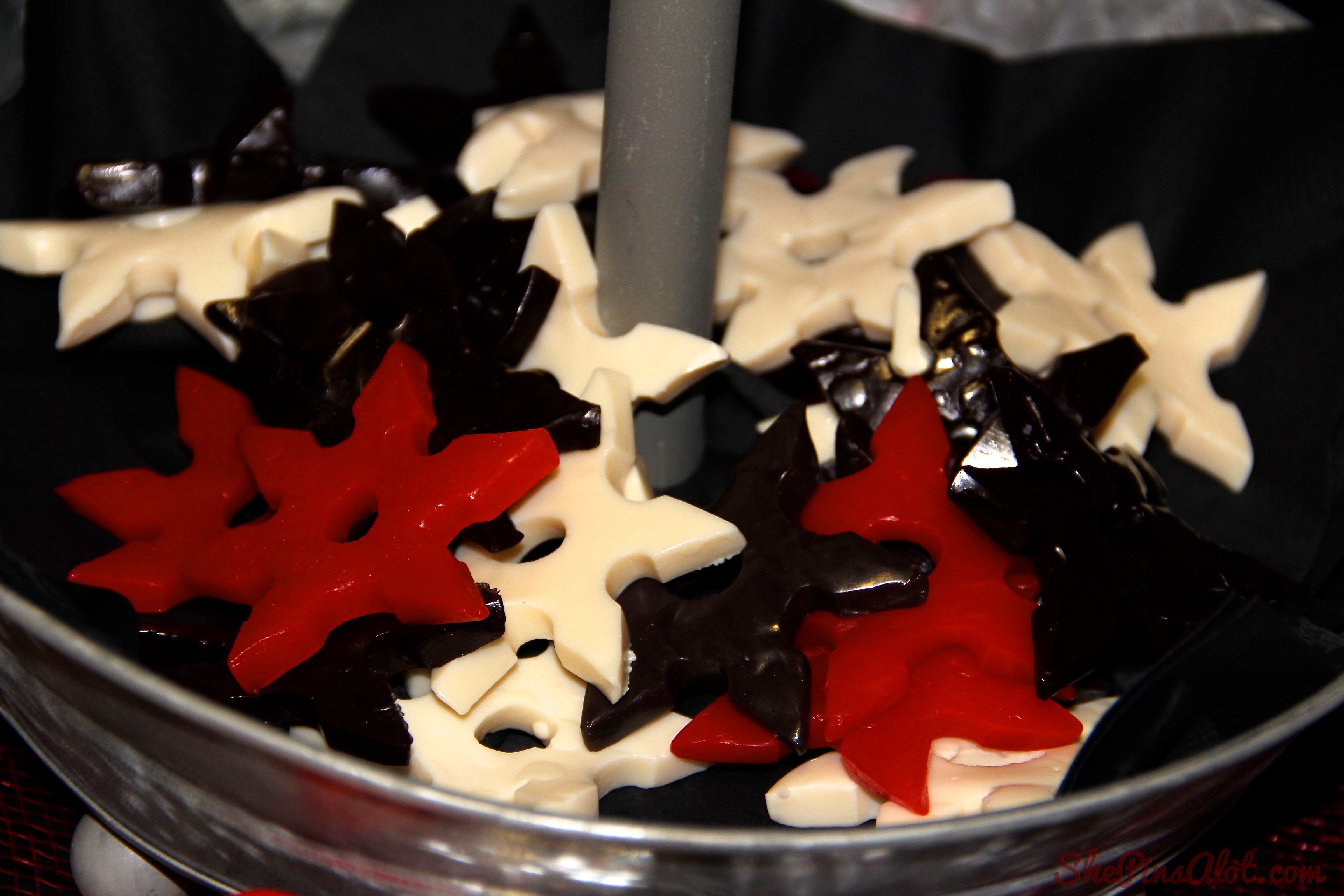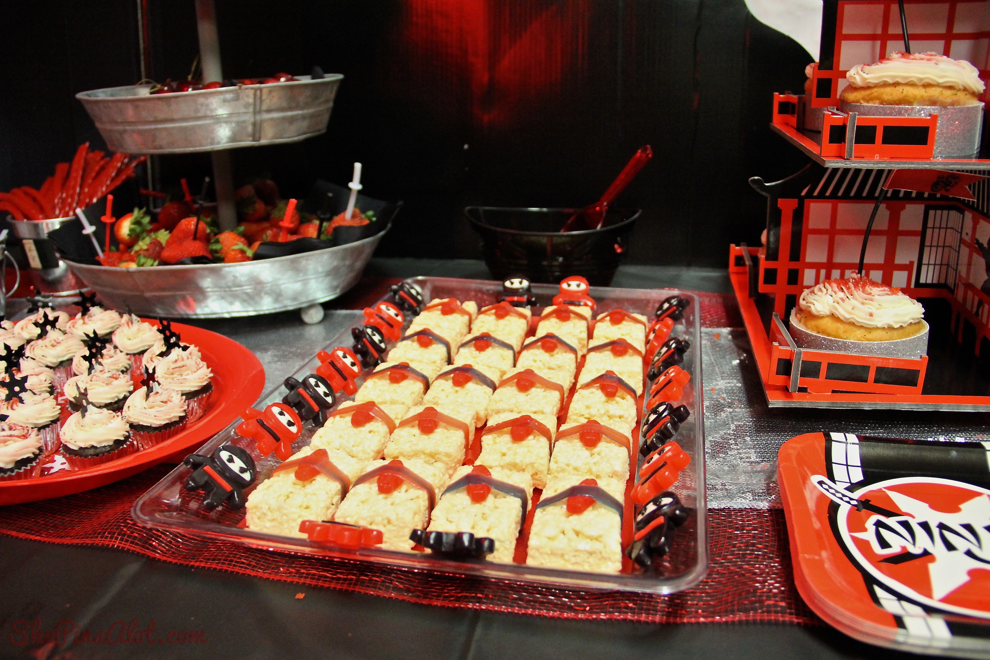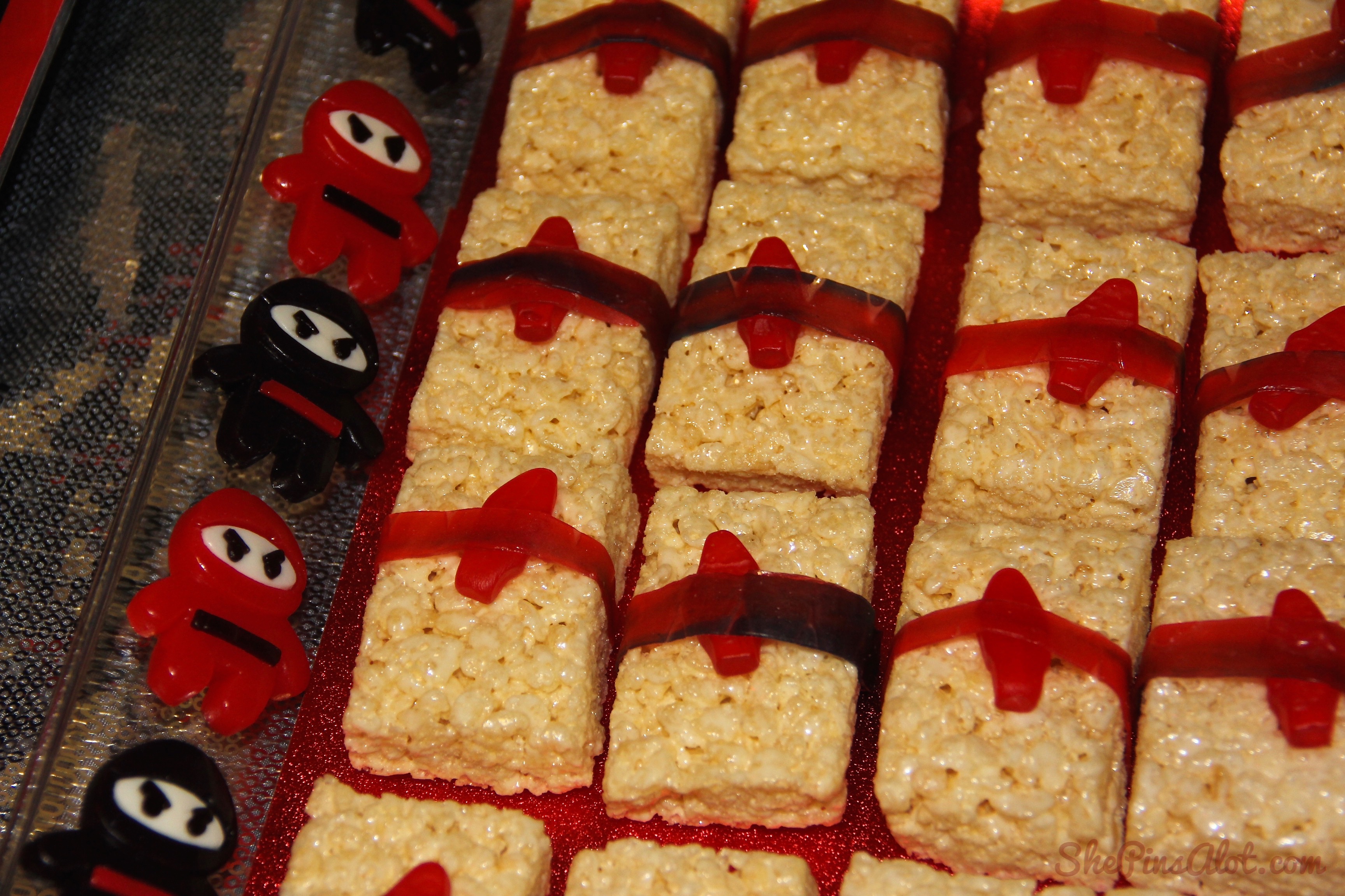 Very popular on Pinterest were the Rice Krispy treat “sushi”. I totally cheated on these and just bought a box of the pre-made ones from Costco. A box of fruit rollups and swedish fish are all you need to complete them. This was also the perfect thing for Teddy to help with! He is the one who made them all! The gummy ninjas were another Oriental Trading company find! The clear trays are one of my reusable items. I change out cardstock on them to fit the current theme. This time i found gorgeous red foil paper and just cut it to size.